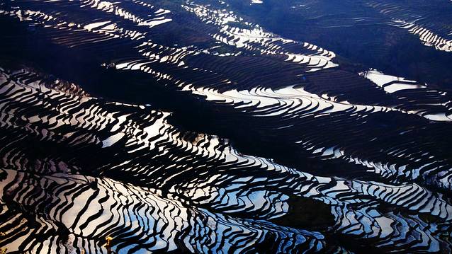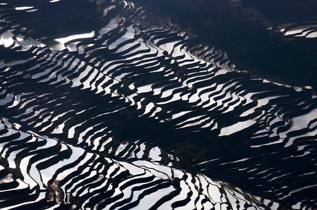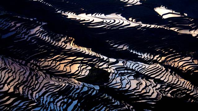 当霞光完全被云雾遮挡,梯田又变回如版画般的简约颜色。