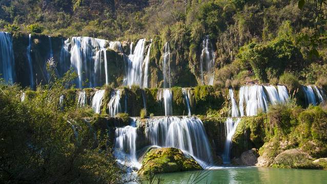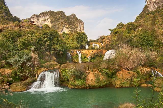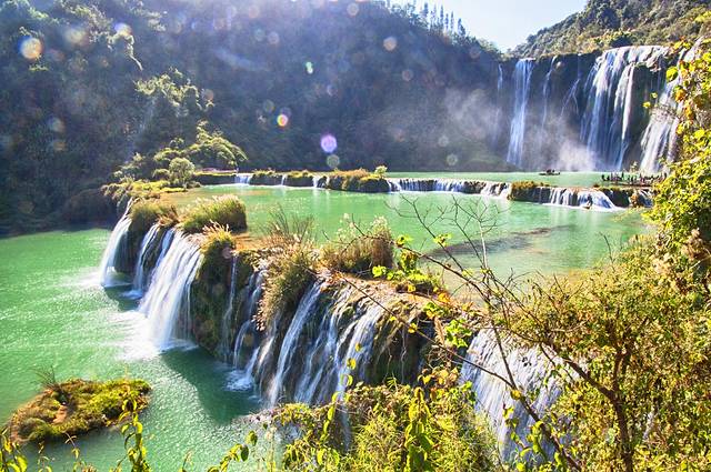 瀑与瀑之间有无数的浅滩和深潭,各显丰姿。大大小小的瀑布,或细柔若丝,仿佛一根根丝线在随风飘舞,或水花翻滚,波光闪烁,或似天河泻落,势如雷霆万钧,震撼山河,或鱼群弄瀑抢水,景致迷人。裂帛般的白瀑,绿玉般的流水,阶梯状层层叠叠的水台,但是绕着水瀑蜿蜓而下,不同的角度都会给你一阵阵的惊喜。