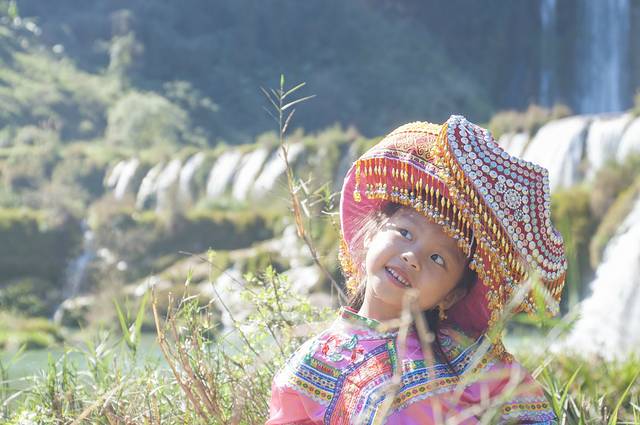 来到瀑布跟前,有很多布依族妇女在出租民族服装,见价格不贵,才5元一套。便租了一套给女儿拍照。