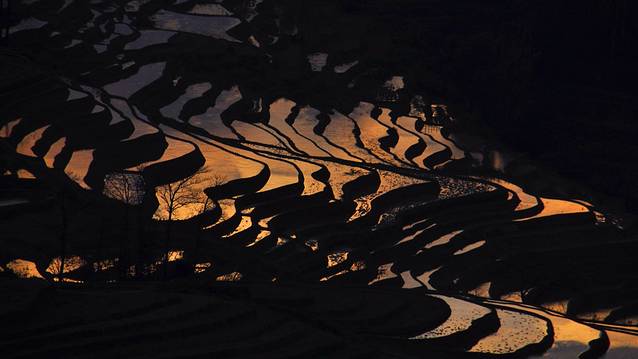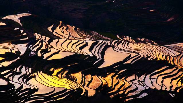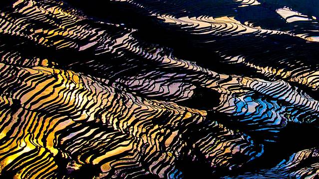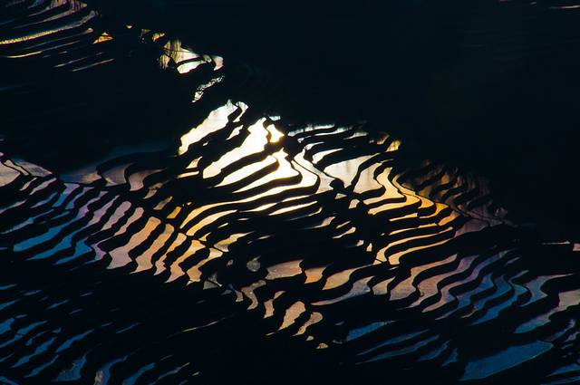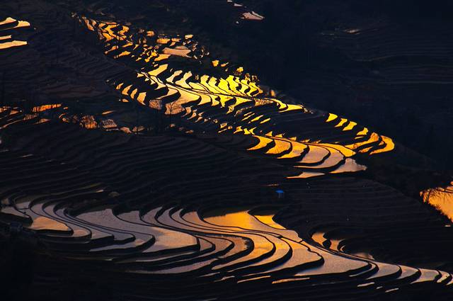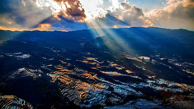 斜阳将天空染得金黄,偶尔一缕阳光穿过厚厚的云层,撒落在哀牢山深处的万千“明镜”之上。光线在蓄满水的梯田镜面反射之下或形成道道金光,或分解成彩虹般的七彩光。那美感真是难以用言语表达。