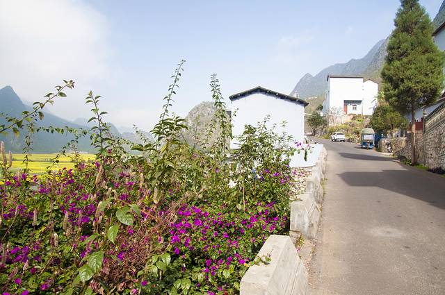 蓝天白云之下,除了金黄的油菜花,还有那如火的三角梅,映衬着洁白的房子,煞是好看。