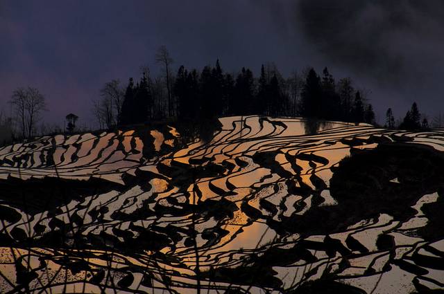 快到达二郎村的时候,经过一处梯田,虽然不是规模特别宏大,但造型线条却非常美,当时想着天色渐暗,怕去到二郎瀑布天全黑了,又想着后面还要去元阳梯田,便没停下来拍摄,实际上那个梯田非常值得一拍,而且回来网上找不到相关的照片。现在回想起来感觉很遗憾。