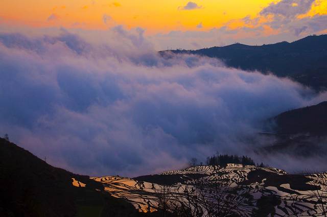 春节期间的元阳梯田绝对是一年中最旺的季节,各种摄影团蜂拥而至。皆因梯田最美就是这个期间,灌满水的梯田仿佛散落山间的大小镜子,倒映着幻变的天空。而一天中最美的时刻就是日出日落了,如果有幸遇上火烧云,那必定是最美不过了。