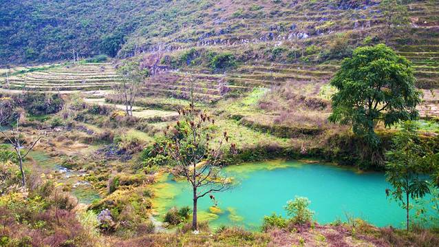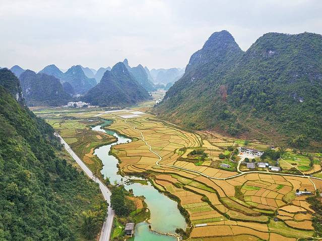航拍的爱布村,碧绿的难滩河在爱布村跌落数级,形成了爱布瀑布群。这条河还是黑水河和德天瀑布的归春河的上游,属于珠江水系的一部分。