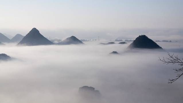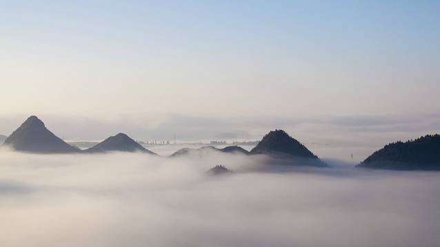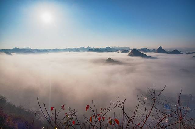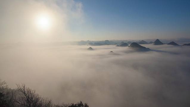 今天的天气确实让人担心,从清晨六点到八点前,目光所见全是一片浓雾,能见度不到十米,相机架了两小时,一张照片也没拍。已经过了天气预报的日出时间,想拍日出看来是不可能的了。很多人在八点时已经等不及下山了。偏偏这个时候,越升越高的太阳刺穿了云雾。远处的峰丛开始显露出山头。