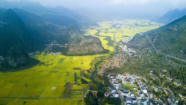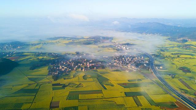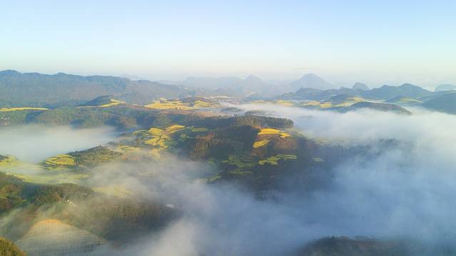 无人机可以飞到云雾较薄的地方,一览罗平的金黄大地。