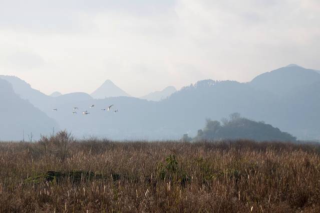 一群群白鹭、天鹅等大型水鸟在清晨出来觅食,果然是早起的鸟儿有虫吃,早起的人儿才能看到好风景。