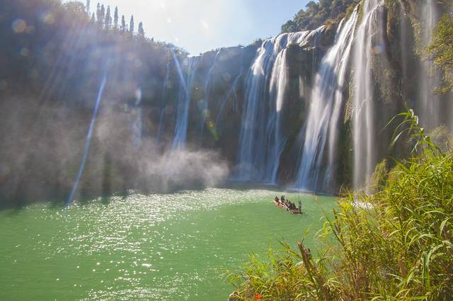 瀑布激扬的水雾在镜头上形成一个个美丽光斑
