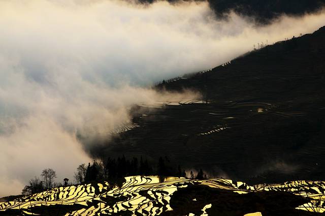 在拍了无数废片之后,太阳终于从云雾中探出了头,一缕金光撒在梯田的边沿,这个世界顿时多了颜色。