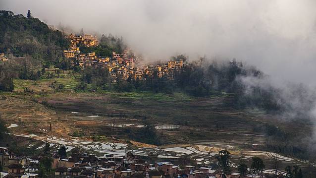 数公里外,迷雾中的元阳新县城——新街镇,和眼前的箐口村隔田相望。彼此独特的建筑风格形成鲜明的对比。