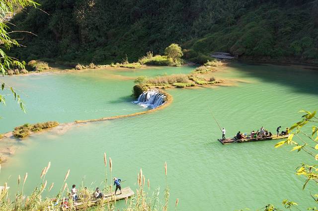 神龙瀑前有个圆形的深潭,几叶竹筏在潭里供游客乘坐。如果想近距离感受瀑布的气势,坐竹筏是不错的选择。