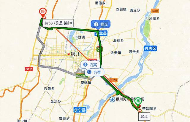 3、银川出发——银川高速机场方向——临河出口——银青高速辅道宁东方向——水洞沟