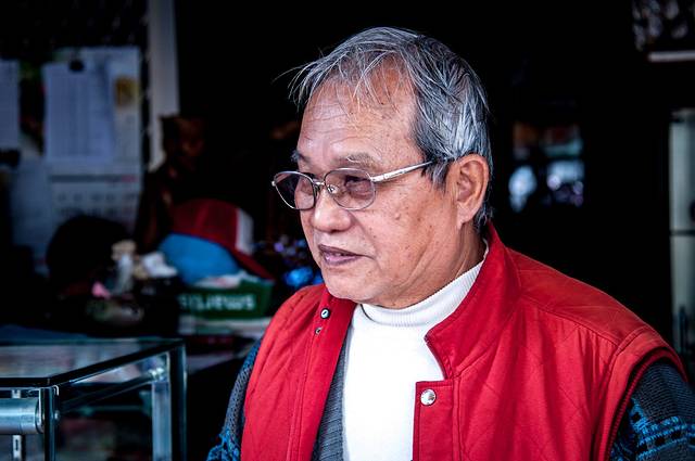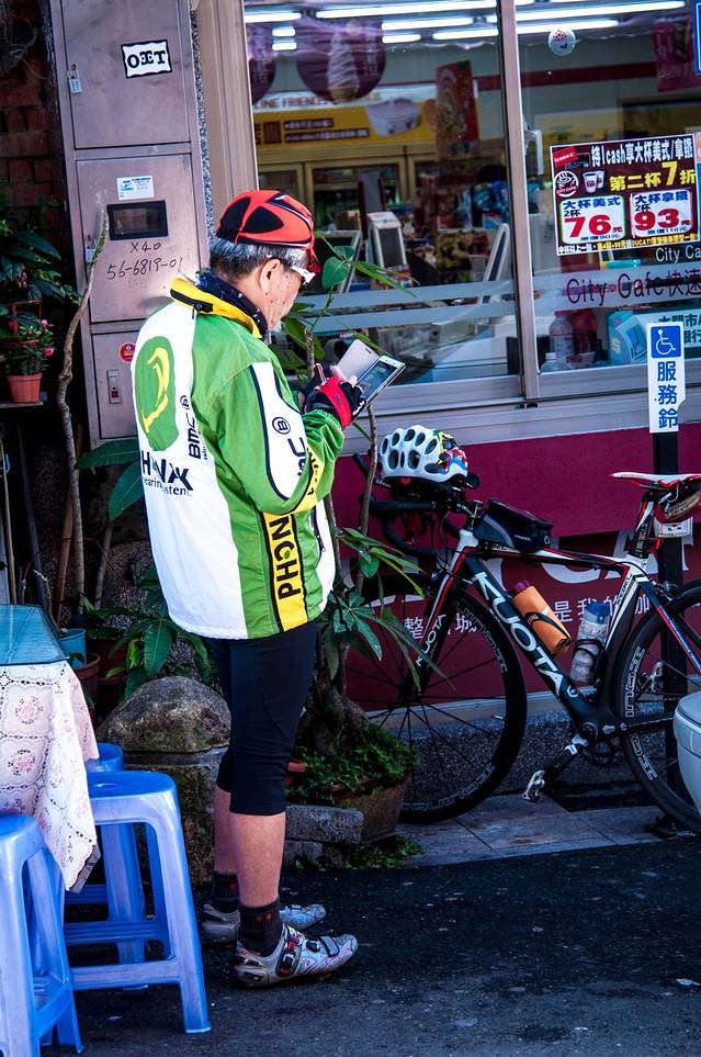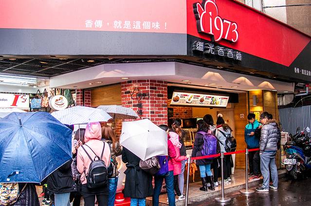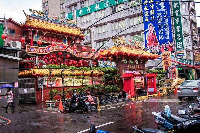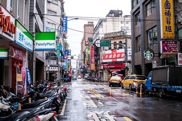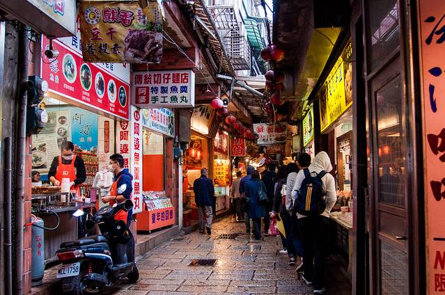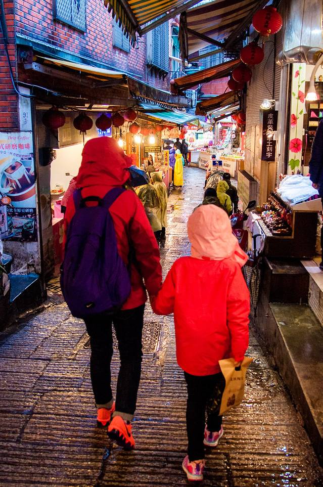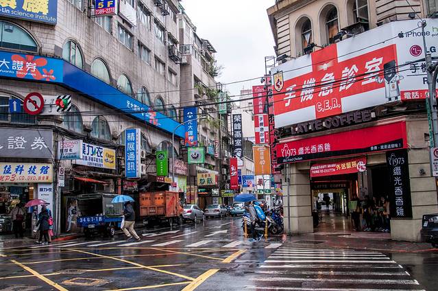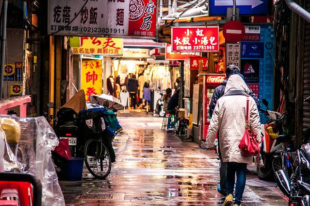 雨丝飘落在身上,凉意阵阵,雨虽不大,但足以将衣服打湿,好在我们都穿了防雨的冲锋衣,而且店铺门前都有走廊,所以无需打伞。计程车司机没有骗我们,今天的台北格外冷,我们冲锋衣下都套上了羽绒服。