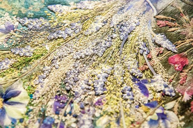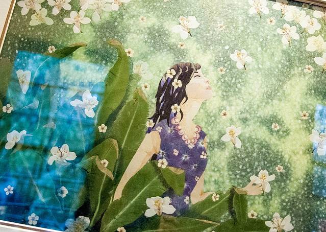 仔细看,画面中的花是由真的花瓣拼成的,而且不只是花朵,每幅画的每个部分都是由花草和树叶拼成的。