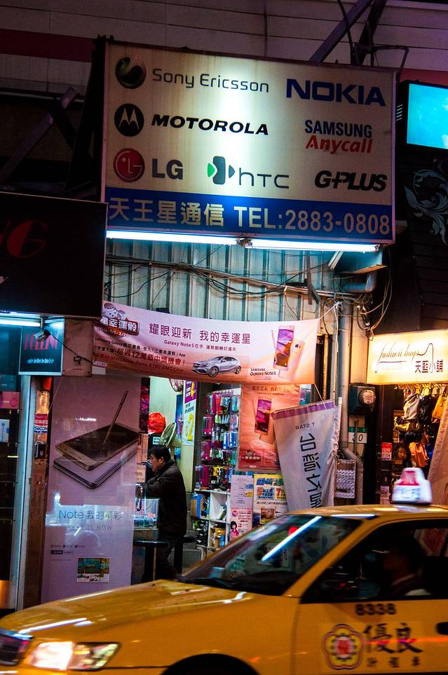 到达夜市后一直未找到停车位,问一摊主大姐,她看看表说,现在停在路边无妨,警察已经下班了。路对面手机店的广告牌不知已经多久未换了,其中大多数的手机品牌都已没落甚至消失了。