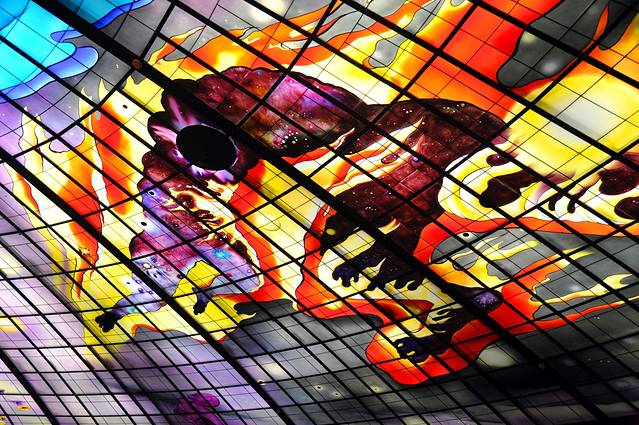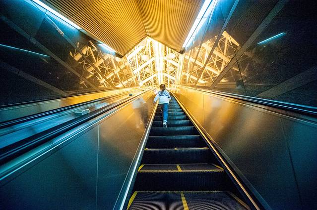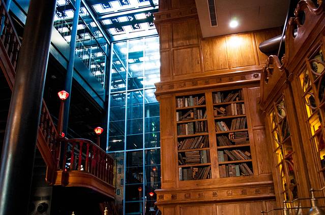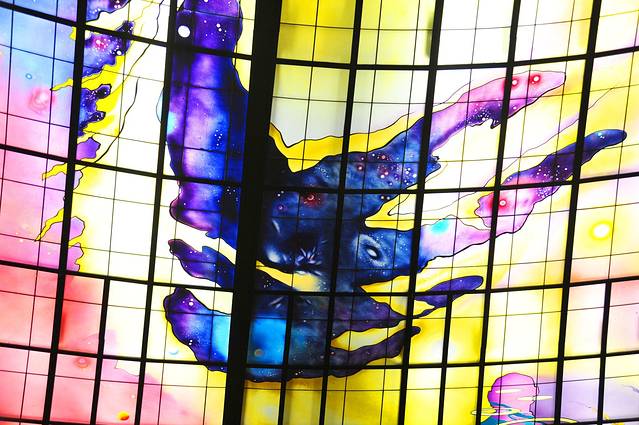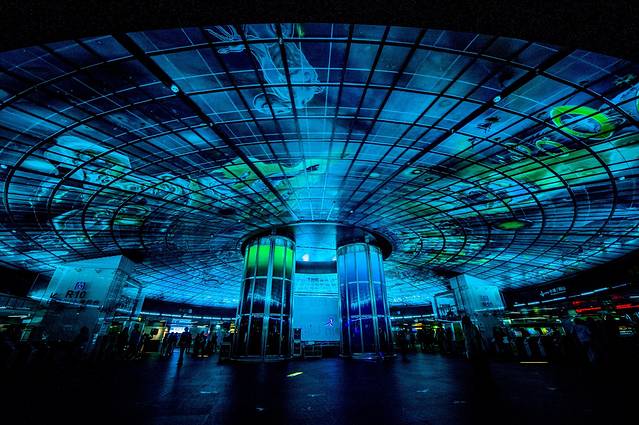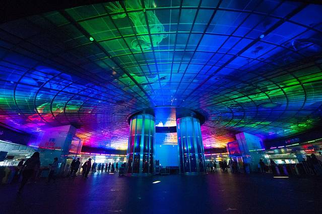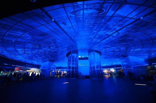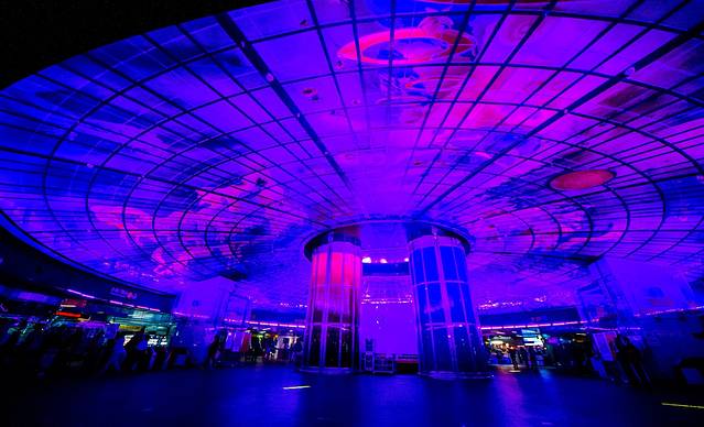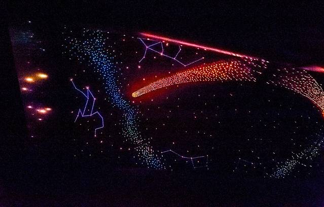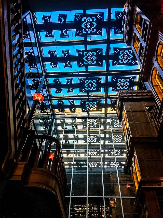 电梯运行时,灯光暗下来,只有顶部的灯光在变换,这是浩瀚的宇宙星空,不时有彗星与流星划过,非常漂亮。这部电梯是高速电梯,少顷便已抵达顶层,让人感觉非常穿越。