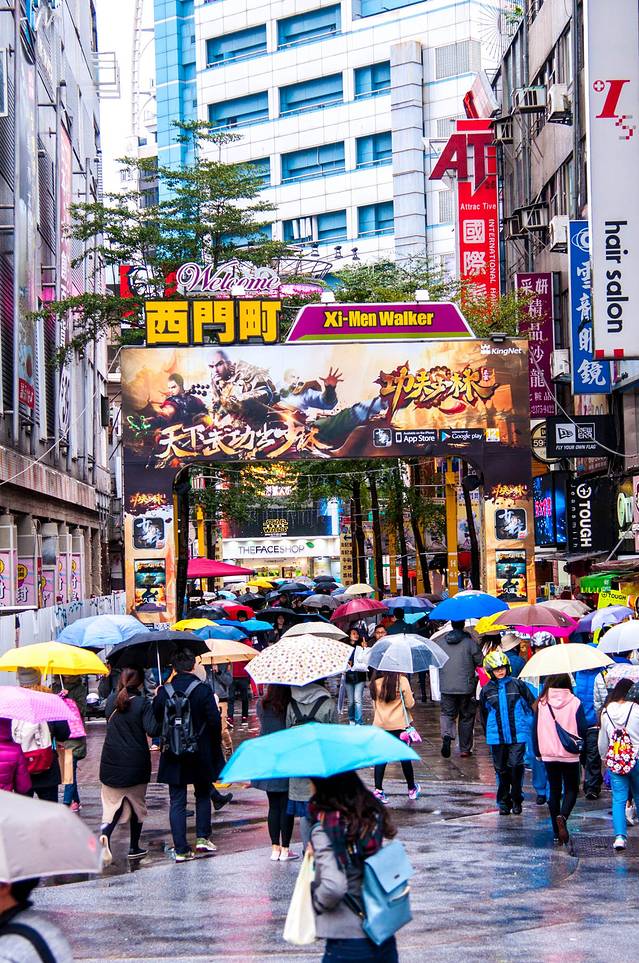 穿过通道,走出捷运站便看到西门町的牌子了。西门町是类似于上海南京路的步行街,虽然细雨绵绵,但街上依然人流如织,煞是热闹。