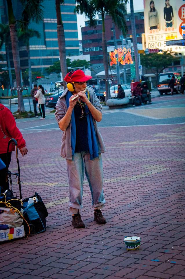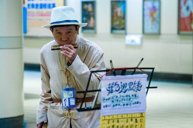 捷运站通道中吹口琴的艺人,胸前挂着写有“街头艺人”字样的工作证。