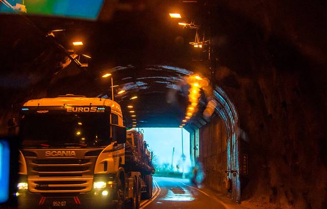 狭窄的隧道中,砂石车已经压过了双黄线。除了天生脆弱,后天人为因素,也迫使苏花公路一步步成为“死亡之路”。因台湾东海岸盛产大理石、石灰岩和砂石等工业原料,故而在苏花公路上,常见到砂石车和大货车高速通行,而这种砂石车是苏花公路上最危险的杀手。
