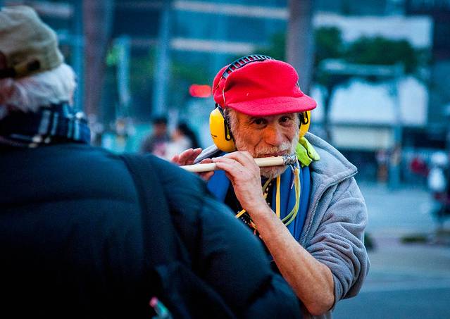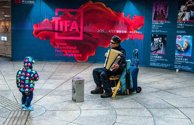 捷运站通道里又遇到拉手风琴的街头艺人,戴着墨镜,表情专注,琴声悦耳,不远的地方有一位小观众在聆听。看得出他是位盲人乐师,装钱的箱子被一条铁索拴在椅子上。