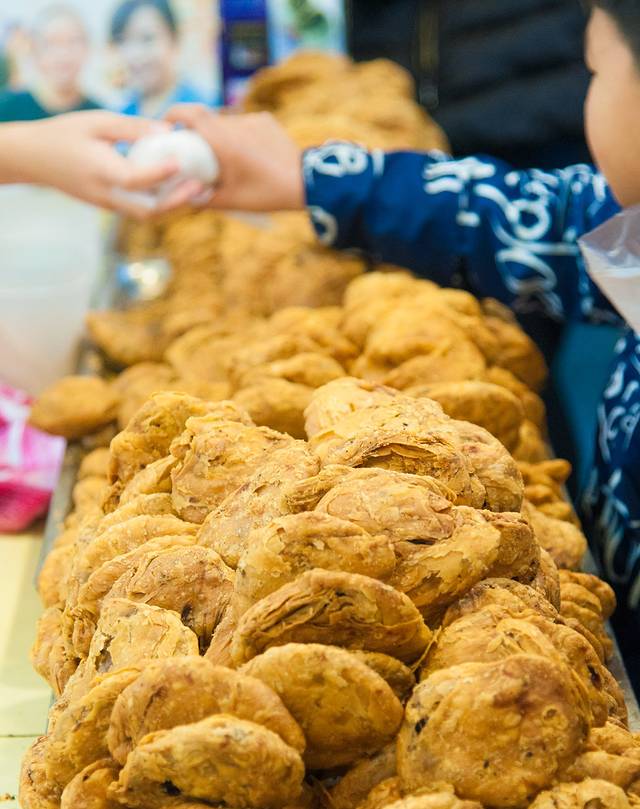 将不同口味的酥饼包在软面饼中,用木锤敲碎便是大饼包小饼基本的制作工艺了。