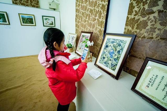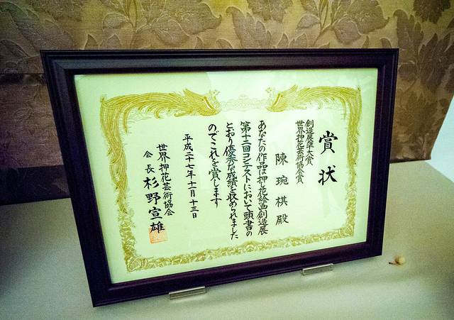 放映厅里有一个奖状,颁奖单位叫做“世界押花芸术协会”,会长是日本人,获奖者名字虽然是四个字,但看得出应该是中国人。