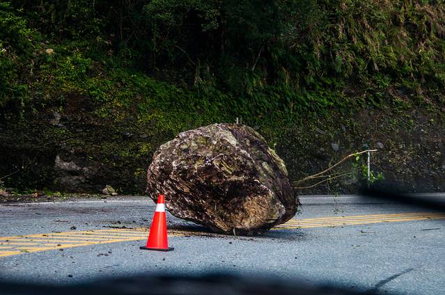 横亘在道路中间的巨大落石,足有我们半辆车大,此时并非雨季,也可见雨季时苏花公路的泥石流与落石有多么危险。