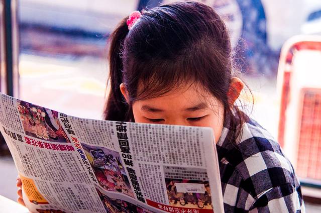 桌上放着当日报纸供等餐的客人取阅,小语第一次看竖排的文字,加之是繁体字,所以看得有些吃力。