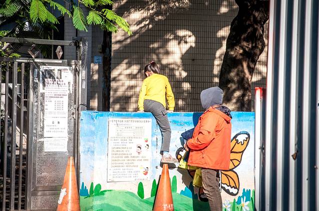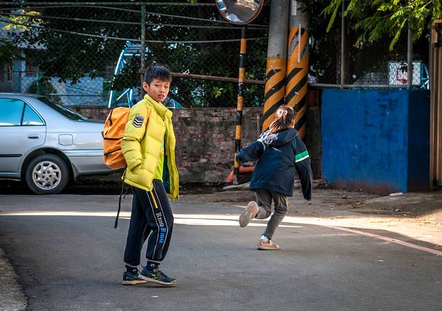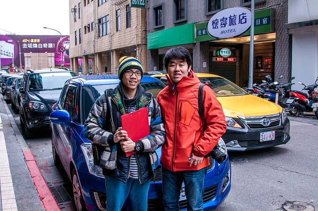 男孩转身走出几步后再度折返准备送雨伞给我们,我们再次感谢婉拒,台北人真的太好了!出乎我们所有人预料,男孩和同事走出十几米远后第三度折返,将伞塞给霞说担心小妹妹淋湿,并说很快就到捷运站,可以与同事同撑一把伞。不由分说,他将伞塞到霞的手里便转身离去,与同事女孩很快便消失在夜色里。这一切发生的过于突然,以至于我想起拍照的时候,只能拍下他模糊的背影,就是照片中左边那位高高瘦瘦的男孩子。我距离稍远,听他的声音应该是大学毕业前后的年纪,现在也是台湾的寒假,或许他是利用假期参加社会实践的学生吧。
