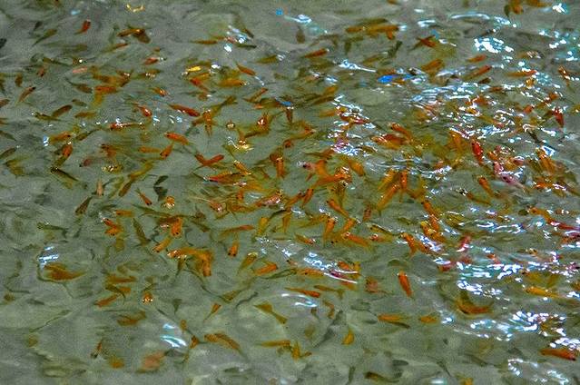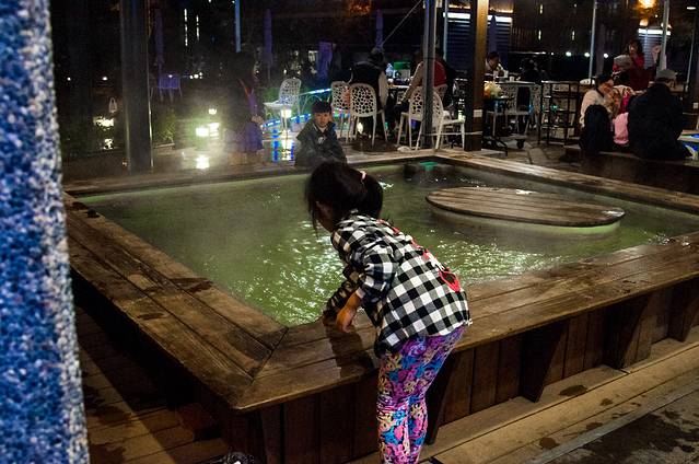 路边的啤酒拍档也有温泉泡脚池,不过这里是收费的,因为水中满满一池小鱼,小鲤鱼在这里活活进化成了热带鱼。