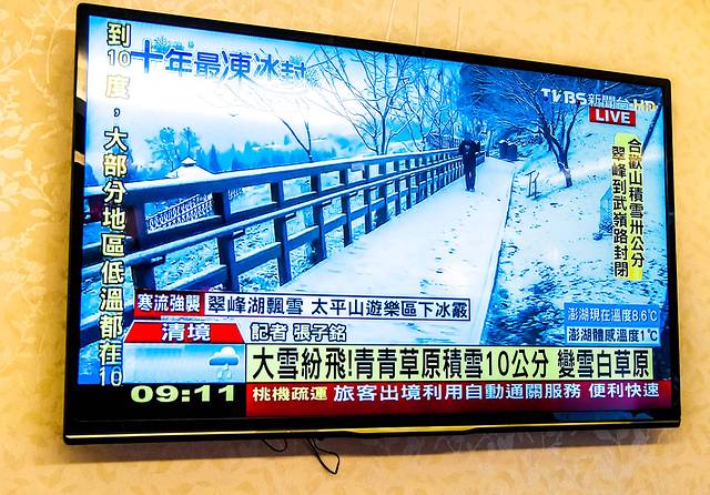 餐厅电视中播放着新闻,昨夜台湾的山区普降大雪,台湾媒体很有意思,用“帝王级”来形容。这是台湾十年来最冻冰封,来得早不如来得巧,我们赶上了台北最冷的一天。
