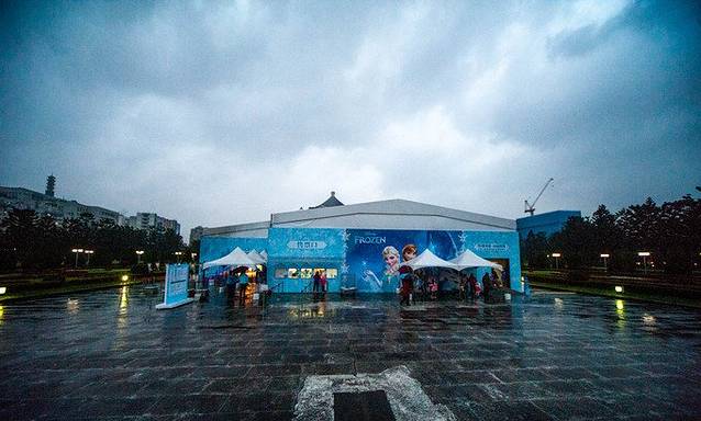 原来这才是她的目标,在广场上是迪士尼搭建的“冰雪奇缘”临时特展,“冰雪奇缘”的小语非常喜欢的一部动画片,今年的生日礼物才刚刚选择了爱莎公主的玩具。