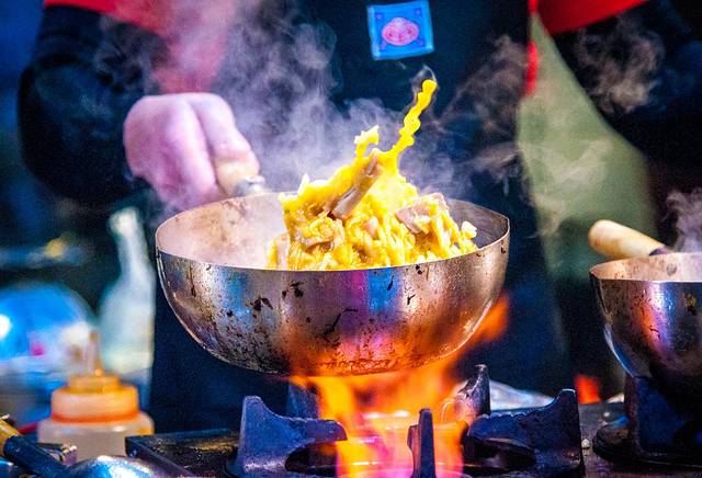 因为下雨,夜市的地下部分更加热闹,这次小语吃的是牛排,老板现场烤制,烤好后趁热上桌。