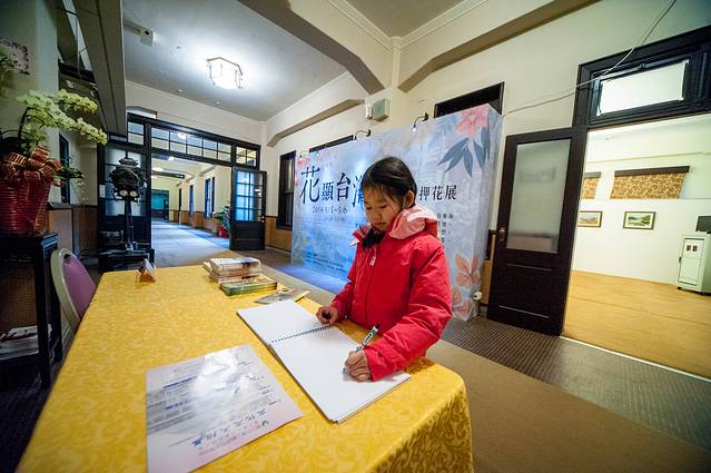 小语身后是这次画展的主题《花显台湾》,据我理解应该取台湾口音“发现台湾”的谐音吧。曾经给台湾客户设计礼盒,他们要求用柿子和花生的图案组合,意为“好事发生(好柿花生)”。