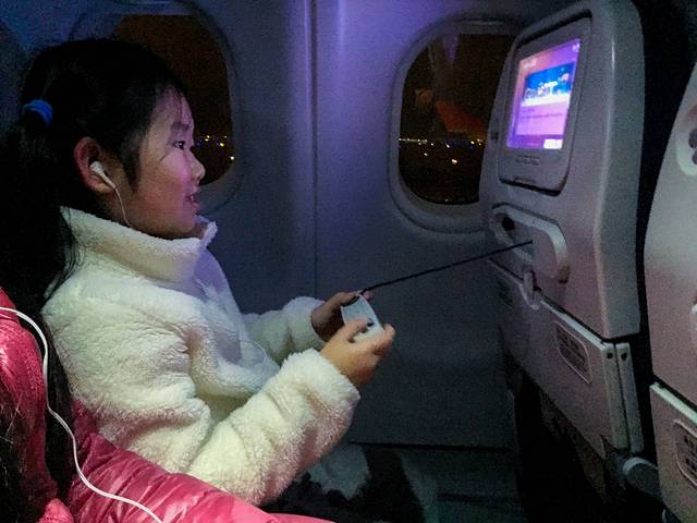 当然,也有惊喜。我们乘坐的复兴航空航班是大飞机,机上配套设备非常完善。小语很快就发现了手柄并玩起了游戏,也好,不用担心她两个多小时飞行的无聊了。