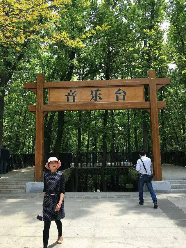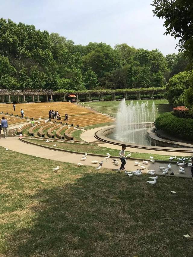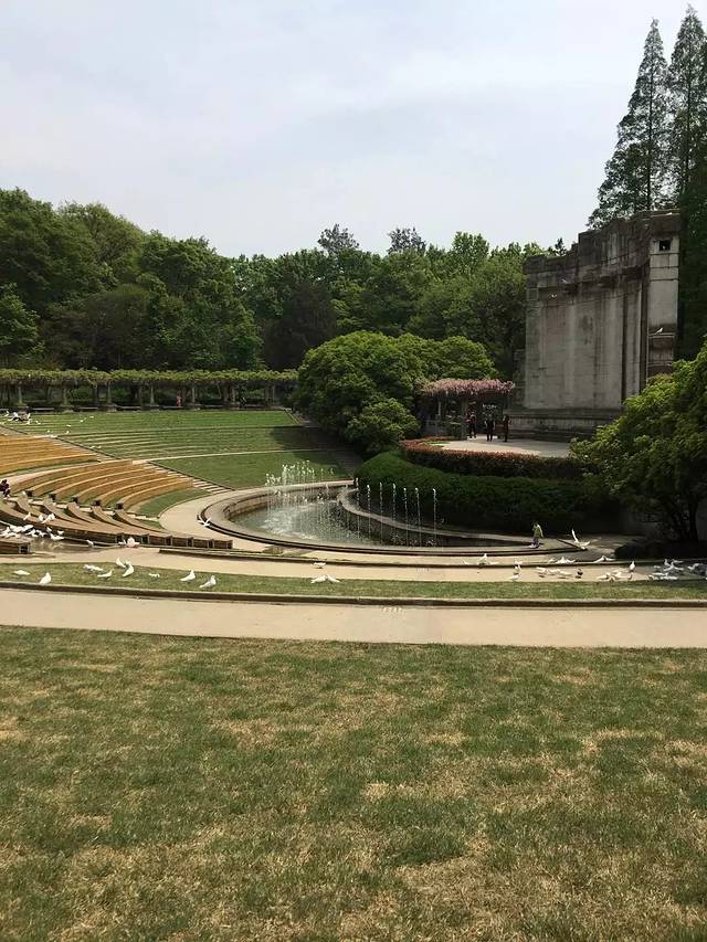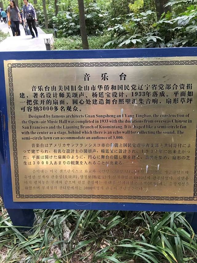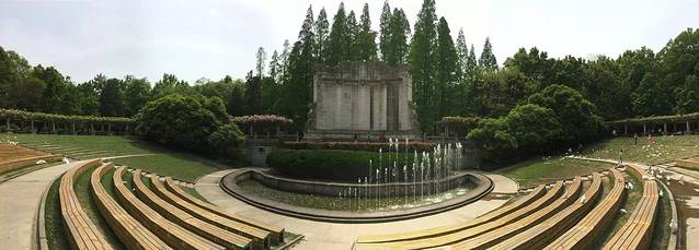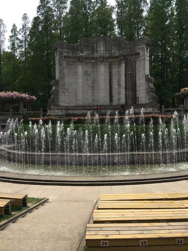 音乐台,位于中山陵广场南,建于1932年至 1933年。音乐台为钢筋混凝土结构,平面为半圆 形。圆中心是舞台,台后建有大壁,同北京回音 壁原理相同,以汇集音浪。壁高11.3米,宽16.7 米,用水泥假石镶面。台前有一汪月牙形莲花池, 池底有伏泉。池前是半圆形草坪,为观众欣赏歌 舞坐处,可容纳三千观众。沿草坪周围绕以水泥 回廊,廊架上攀援着紫藤等花木,是游人休息纳凉的佳境。