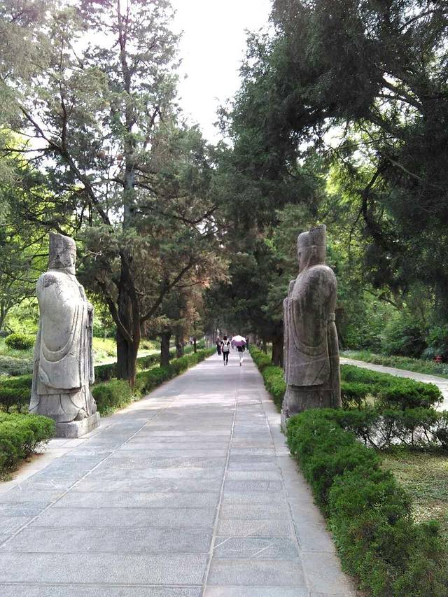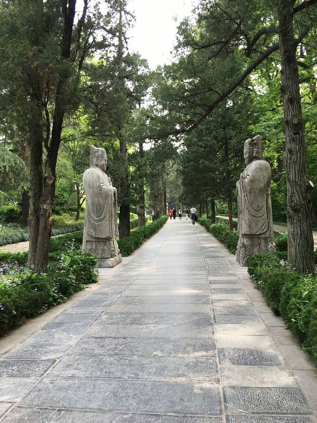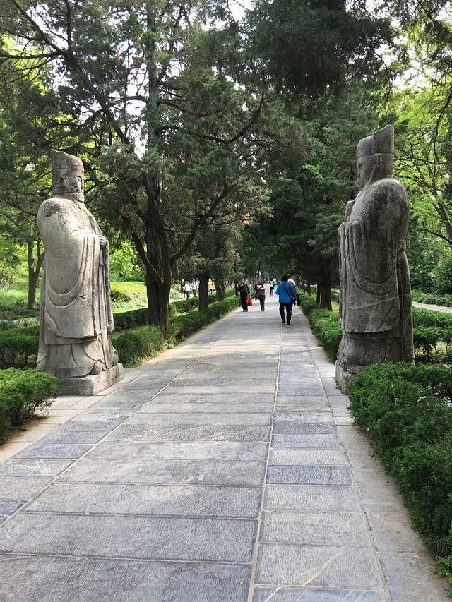 石象路前半段两侧立石兽6种12对,依次是:狮、獬、骆驼、象、麒麟、马,每种4只,两立两卧。石兽尽端立石望柱(又称华表)一对,过此折向北,列石翁仲8躯,文臣武将各四,分立道旁。孝陵石人、石兽均为整块石料雕凿而成,体量高大,生动粗犷,是明代皇陵石刻中的经典之作。