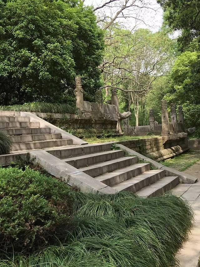 今天的“灵谷深松”碑原为谭延闿墓道碑,墓碑之下有龟趺座,四周围有石栏。碑后有一座南湖石制的牌坊,其后是谭延闿墓墓道。