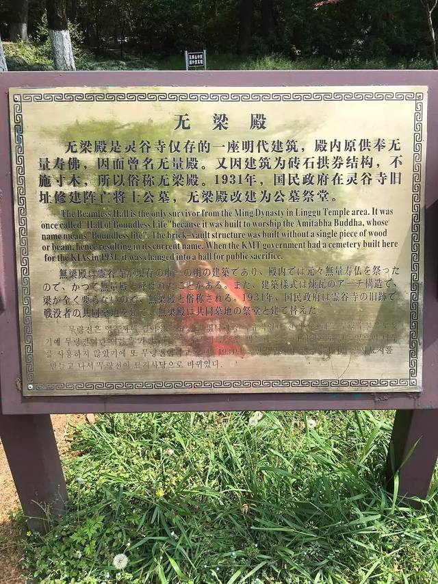 无梁殿是明代保存至今的一座建筑,明清两代曾多次维修。太平天国时期的战火使其殿顶无存,现有的斗栱及重檐歇山屋面为30年代建造阵亡将士公墓时所建。中国其他一些地区如山西五台山、四川峨眉山等地的寺庙中,也有同样结构的无梁殿,但灵谷寺这座无梁殿是规模最大、保存时间最长的一座。