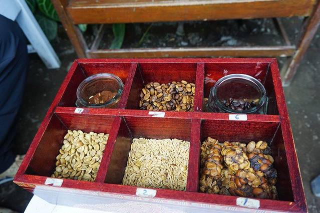 老板把他的猫放在了座椅上,向我们介绍Kopi Luwak(猫屎咖啡)的产生过程。首先将咖啡豆作为食物喂给椰子猫吃,然后它会拉出下图标1的排泄物,然后用旁边的麦粒清洗,清洗完之后会变成旁边的干净的咖啡豆,再把清洗干净之后的咖啡豆进行烘焙、去皮,最后磨粉、冲泡就成了我们现在喝的咖啡。