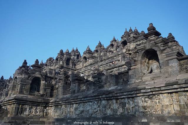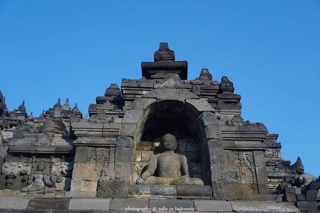 除了石头上雕刻的佛教大千世界故事之外,婆罗浮屠还有许多佛像。双腿交叉的佛像端坐于莲花座上。