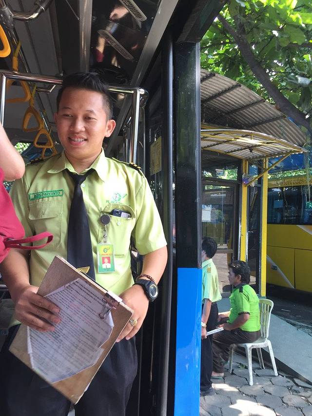 印尼的公交站台都是高于地面的一个站台,然后直接从站台上公交车,不过日惹的公交站台比雅加达的公交车稍微小一点。从一边进站,进站的地方类似于我们国家地铁站的进站口,先交钱然后那边的工作人员再给你刷一下卡让你进去。一辆车配2个人,一个车站也配2个人左右,总觉得有点浪费人力啊~