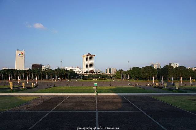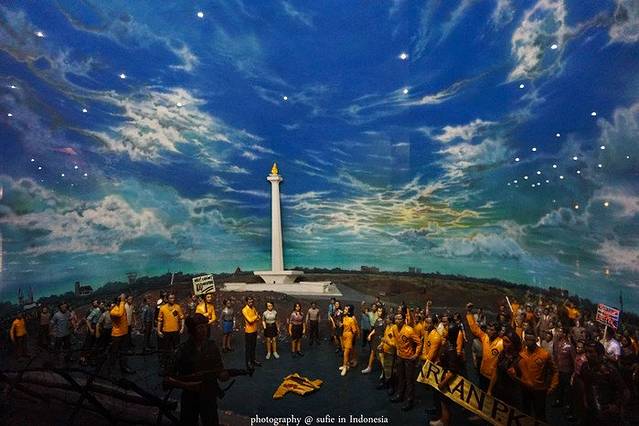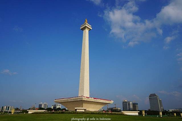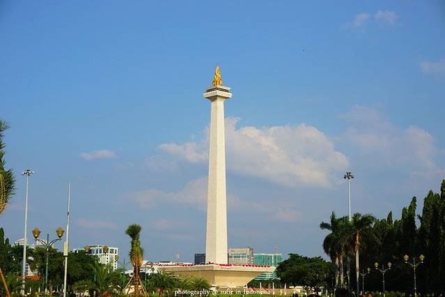 雅加达虽然是印尼的首都,但是却是印尼第三大旅游城市。雅加达的旅游景点要列举出来也多如牛毛,但是真正值得玩的值得看的却不多。雅加达的独立广场是雅加达代表性标志性的景点,虽说是代表性,但是游览价值也只能冲着它是“代表性”给三颗星。独立广场里面有一座塔,中文名字应该可以叫做纪念塔,外文名字是Tugu Monumen Nasiona,据说是印尼最高的建筑,最高的建筑!最顶层可以上去参观,不过要花多一点钱买另外一种票,而且每天还限制人数。这个塔的结构总的来说可以分为三层,第一层就是图中平台下封闭的这一层,里面有很多精致的模型,讲述的是印尼从原始社会开始到最后独立建立印度尼西亚共和国的故事;第二层就是看到的那个大平台,从第一层可以上楼梯上去,也可以从外面的广场上的楼梯上去;第三层就是那个火炬下面有个平台,可以俯瞰整个市中心,从第二层有电梯上去,但是需要检票。说到那个火炬,据说是金子做的,重1.4吨!