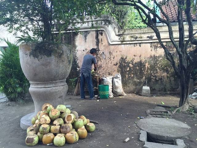下了公车,沿着日惹的马路朝着水上城堡走着。马路两旁的店铺因为开斋节放假都紧闭着门,路上也看不到什么人。走着走着,看到了The water castle的指示牌,我们接着沿着指示牌的方向走着,不过走了半天,也丝毫没有看到一个有类似于景点的入口之类的地方。看到一个卖椰子的地方,坐下来吃个椰子再说。