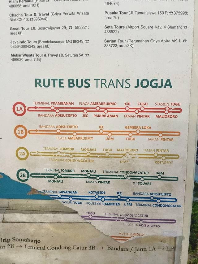 经过大概一个小时的车程就达到了日惹,从车站下来还要再转公交车才能达到市区中心。公交车站就在下车的地方就有,下面这张图是一张公交车站台表,不过已经不是很完整了。