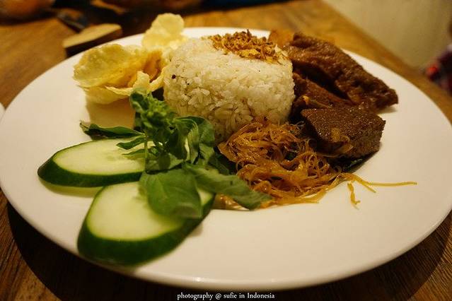印尼的饭菜大部分是炒饭或者炒面,在饭或者面里加上炸的虾片。在爪洼岛上因为绝大部分人信奉伊斯兰教,所以不吃猪肉,以牛肉和鸡肉为主。这一盘20多块钱