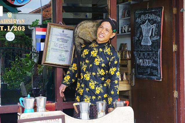 边喝咖啡边聊天,得知这对外国夫妇来自西班牙,正巧老板说他的老婆是巴塞罗那的,还翻出他的结婚照给我们看。老板还让他的椰子猫趴我肩膀上!最后我们问他哪有吃饭的地方,因为外面很多店铺都关门了,他思考了一会让他的朋友送我们去找饭店,虽然找了一圈很多他说的地方也是关门的,但是最后还是送,我们去了马里奥波罗路,也就是日惹的市中心。本来无趣的日惹旅行,却因为一杯猫屎咖啡变得奇妙了起来,这也许就是旅行的乐趣吧,和陌生人相谈甚欢,度过一段难忘的记忆。