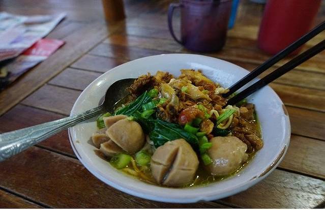 在印尼吃的第一顿,从机场一直到逛完纪念塔都没有吃过饭,肚子早已咕咕叫了,便在独立广场里面找到了像集市一样的地方吃了顿饭。折合10块人民币一碗的面,里面有青菜和牛肉丸还有鸡肉,味道还不错。