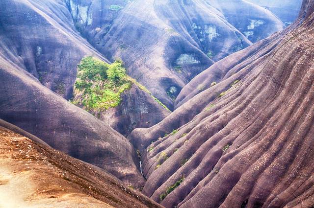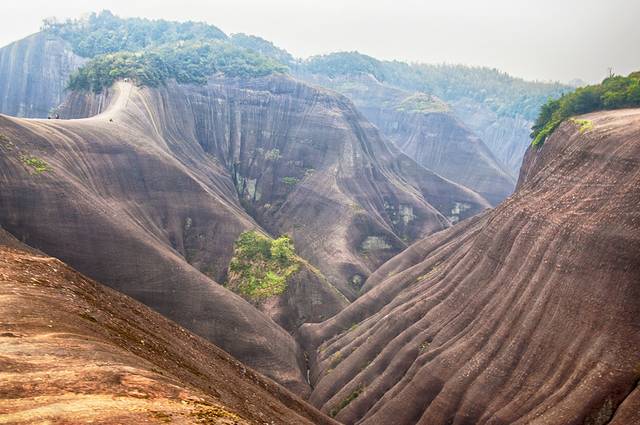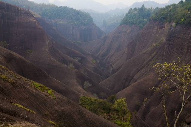 长年的流水把山体冲刷出一道道深壑,远看过去像恐龙的肋骨。