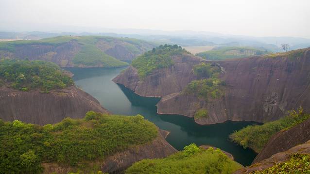 高椅岭丹霞地貌之“美”,不仅美在山水相融、树石相间、犬牙交错、大气磅礴、惊而不险,更美在墨绿色的“天池”环绕着一只在水面张牙舞爪的“巨蜥”。山岭宛若蜥蜴,巨龟,有人称蜥蜴湖或者金龟湖。
